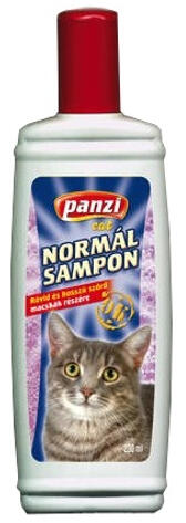 PANZI Normál Sampon cicáknak – A macska fénytelen szőre lágy és csillogó leszÖSSZETÉTEL:  Víz, Texapon, konyhasó, Dehyton PK 45, citrom-sav, kókusz zsírsav, Dehyqart 701, kék és gyöngyházfény festékanyag, Microcare IT vadvirág illatanyag. CÉLÁLLAT FAJ: macska. Oldja a szőrzet különböző szennyeződéseit. Összetétele révén az állat szőrzete még gyakori tisztítás esetén sem szárad ki. Használatával a szőrzet fényes és tiszta lesz. Minden szőrtípusnál használható. Felhasználás: A sampont enyhe masszírozással vigyük fel a kézmeleg vízzel megnedvesített szőrzetre. Az állatot finoman dörzsöljük mindaddig, amíg a képződött hab mindenütt be nem fedi a szőrzetet. A kioldódott szennyeződéseket bő vízzel alaposan öblítsük le. Ügyeljünk arra, hogy a sampon ne kerüljön az állat szemébe, hallójáratába, vagy a szájába.